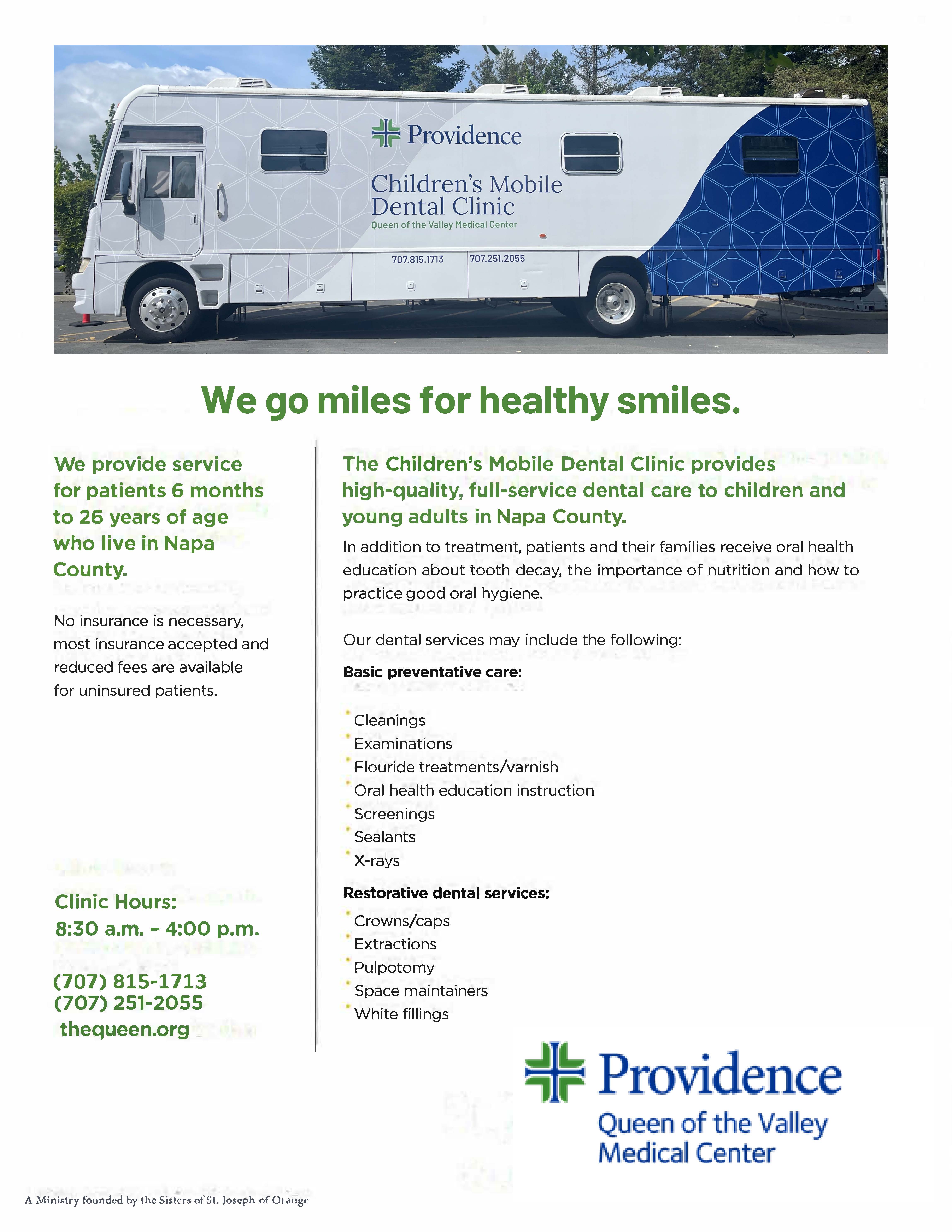 The Providence Children’s Mobile Dental Clinic provides dental care for children and young adults ages 6 months to 26 years old who live in Napa County. No insurance is required. They will be on si...