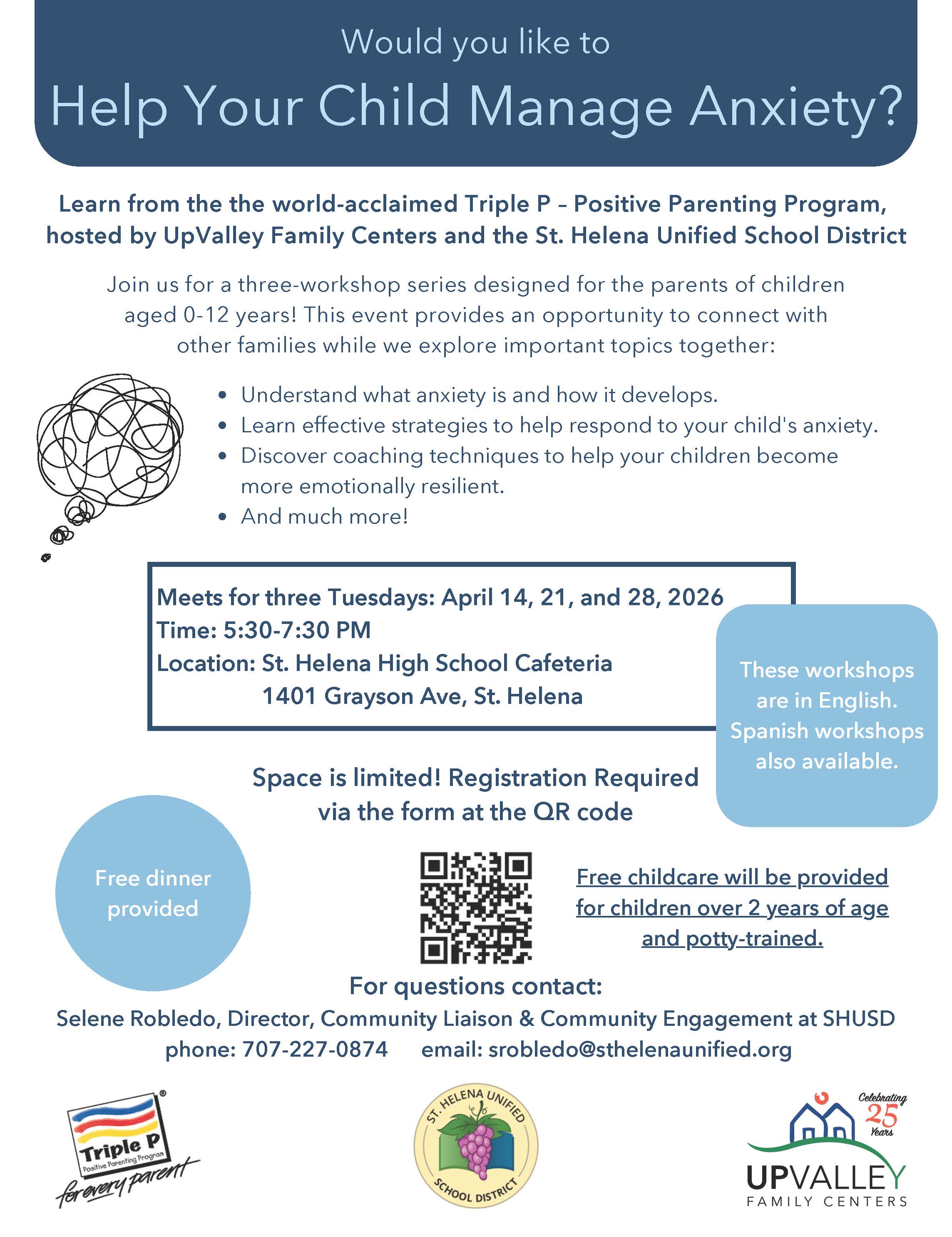 Help your child manage anxiety! Join our free Triple P – Positive Parenting workshops on April 14, 21, and 28 from 5:30–7:30 PM at the St. Helena High School Cafeteria. Open to parents of children ...